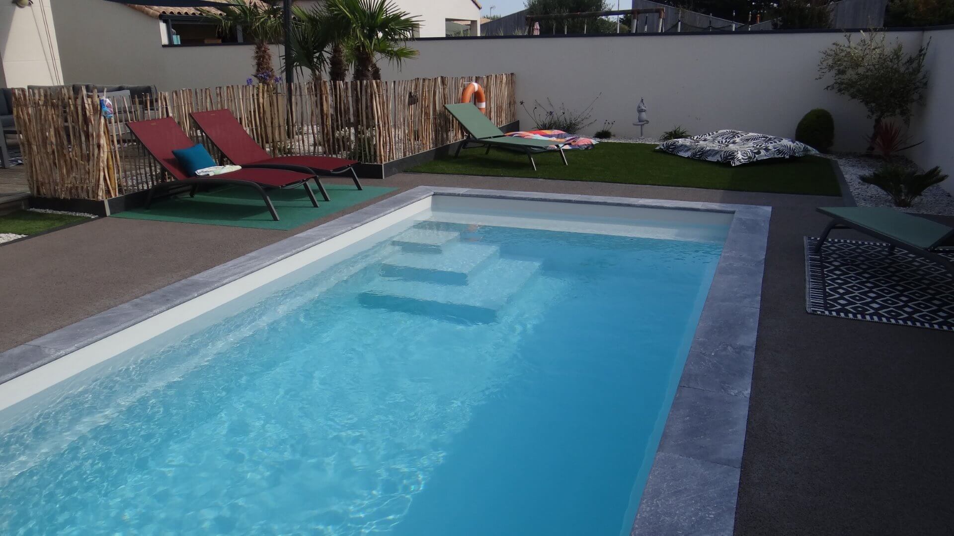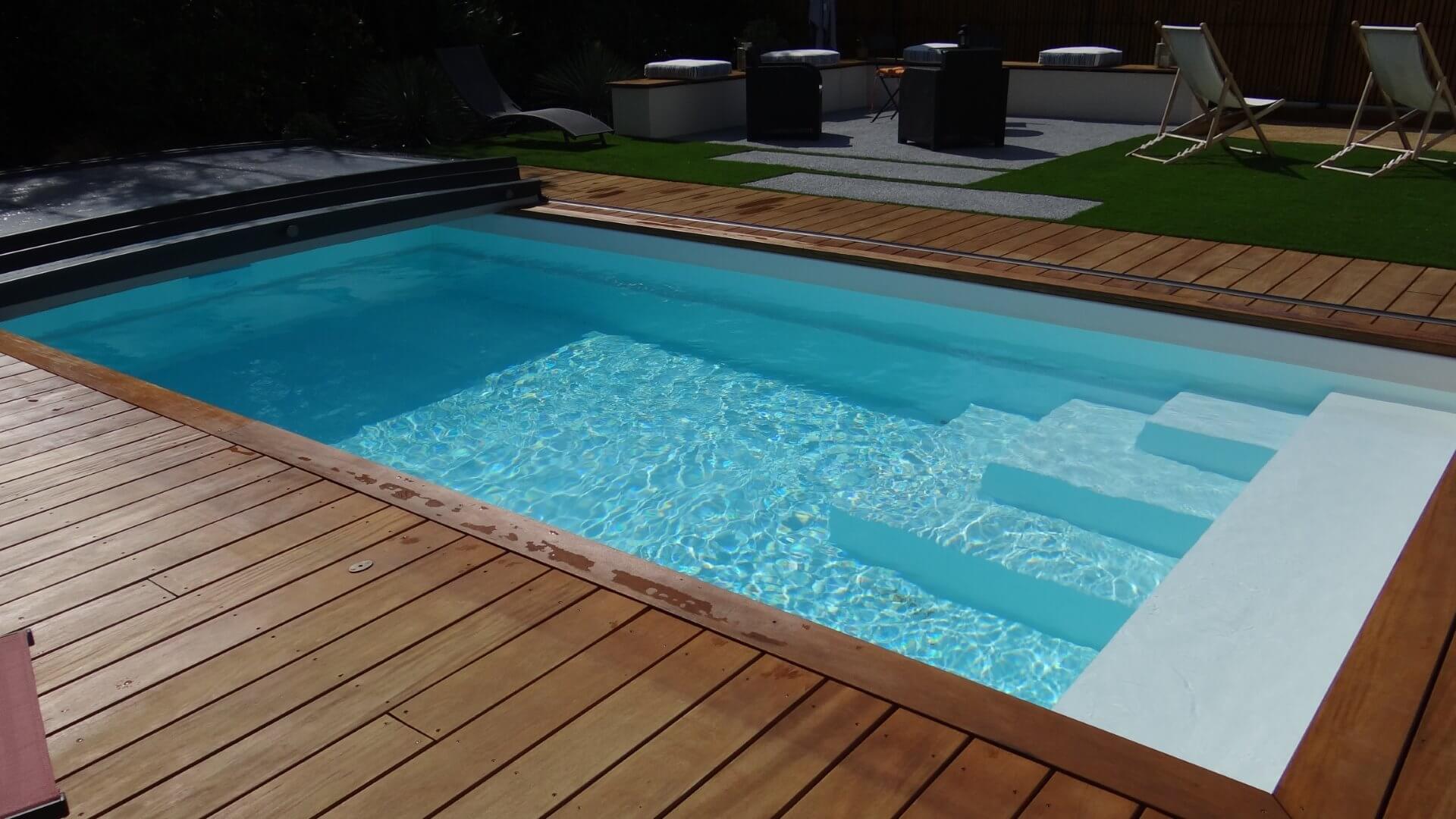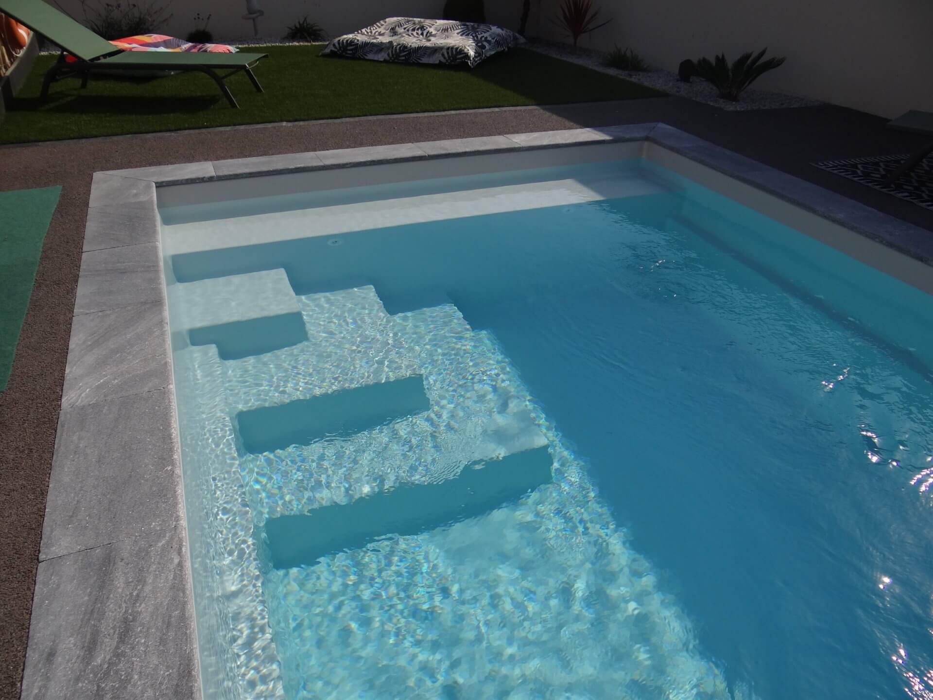 Sa banquette est idéale pour la relaxation et ses marches design sur un côté limitent l’encombrement dans le bassin.