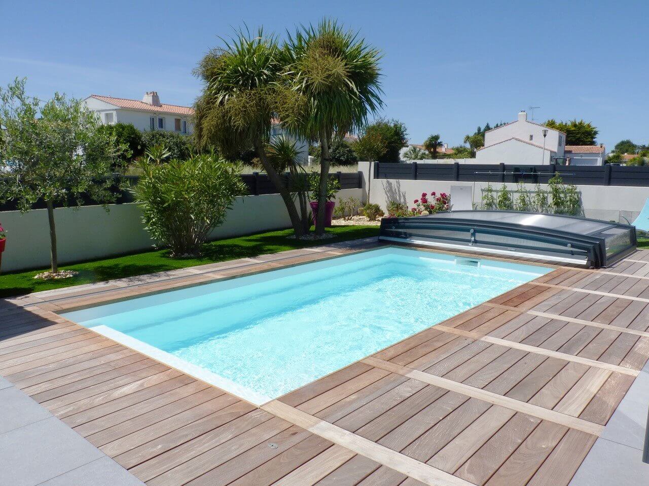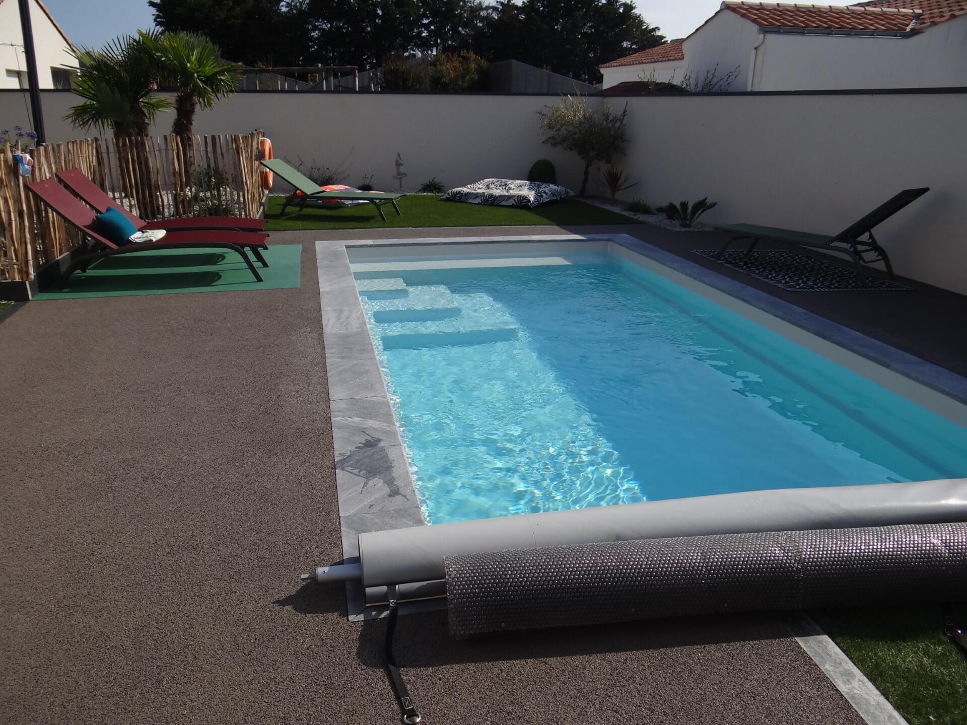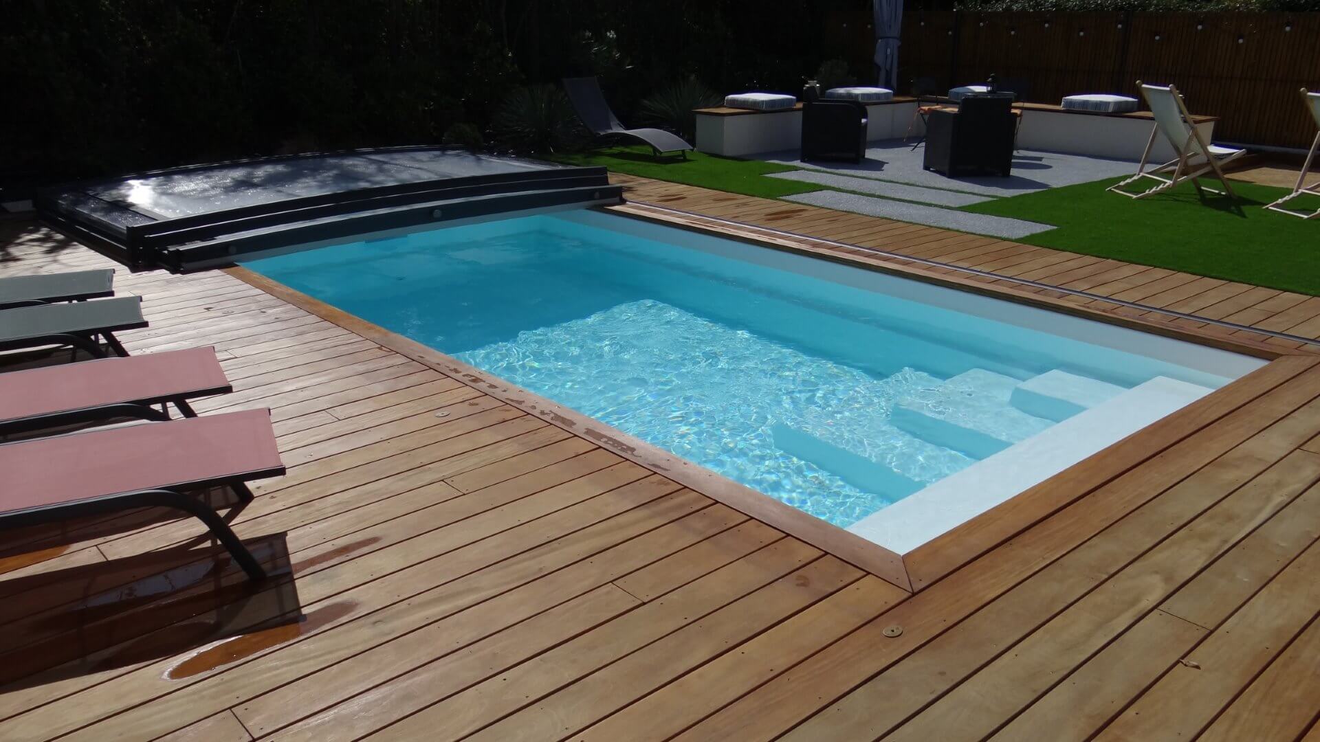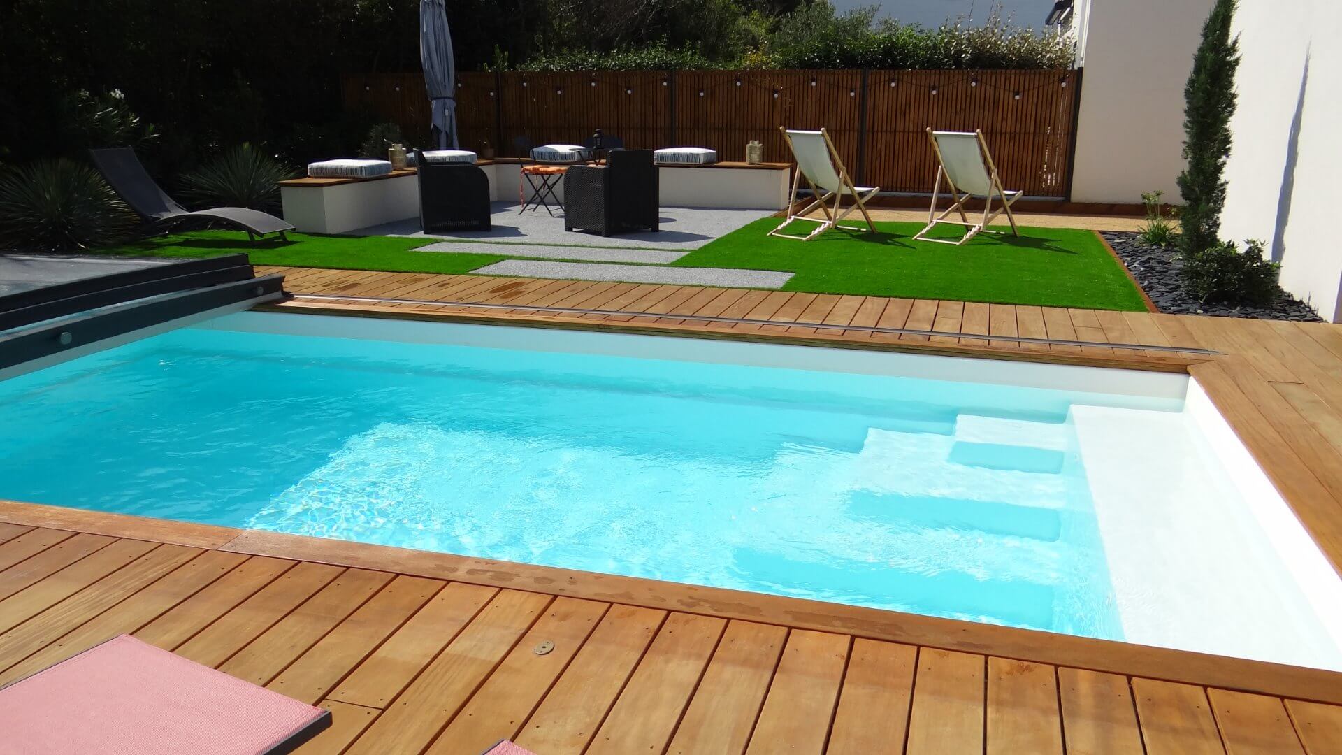 Sa banquette est idéale pour la relaxation et ses marches design sur un côté limitent l’encombrement dans le bassin.